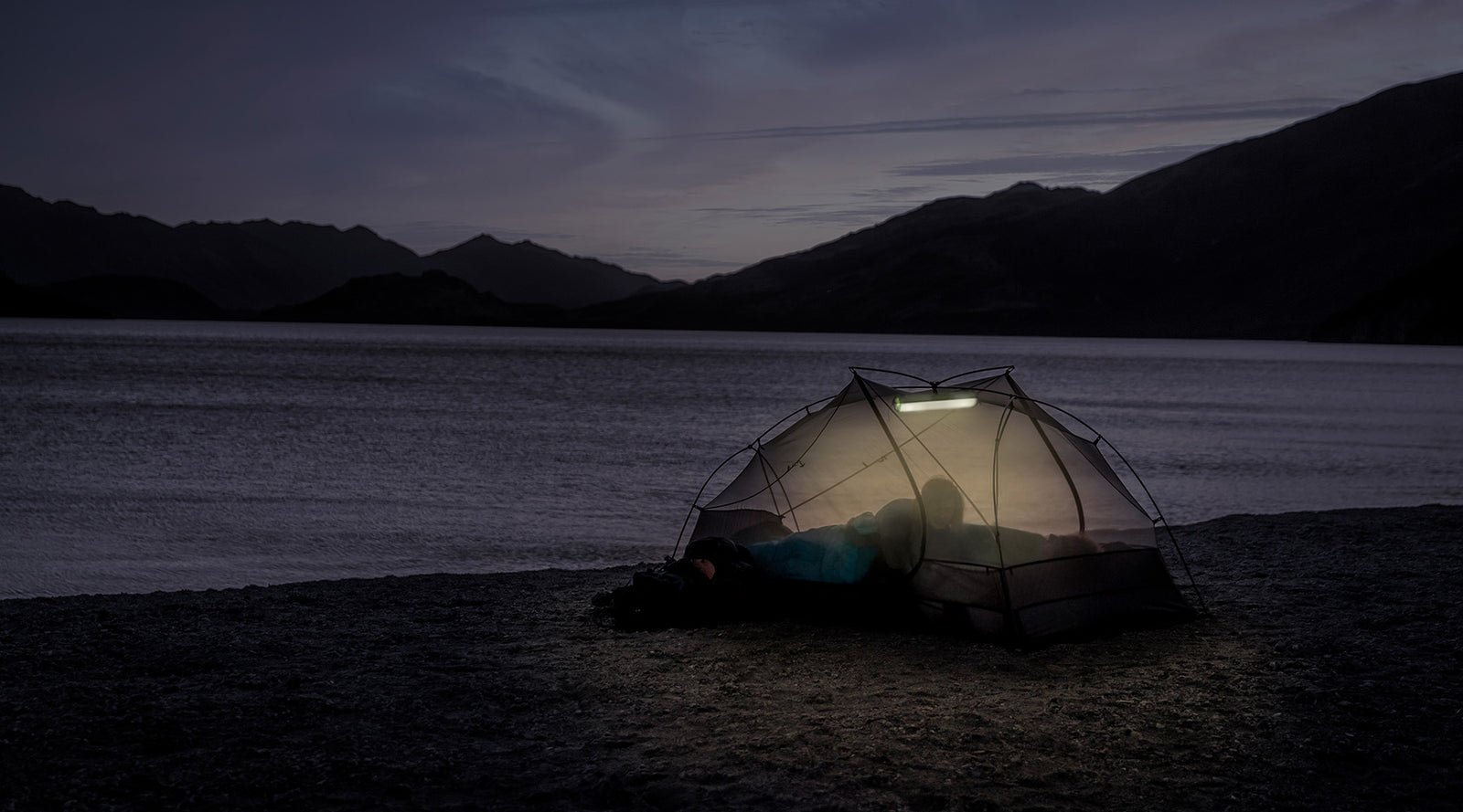 Connect our light-diffusing tent pole bag to the ceiling, add headlamps and let there be light!